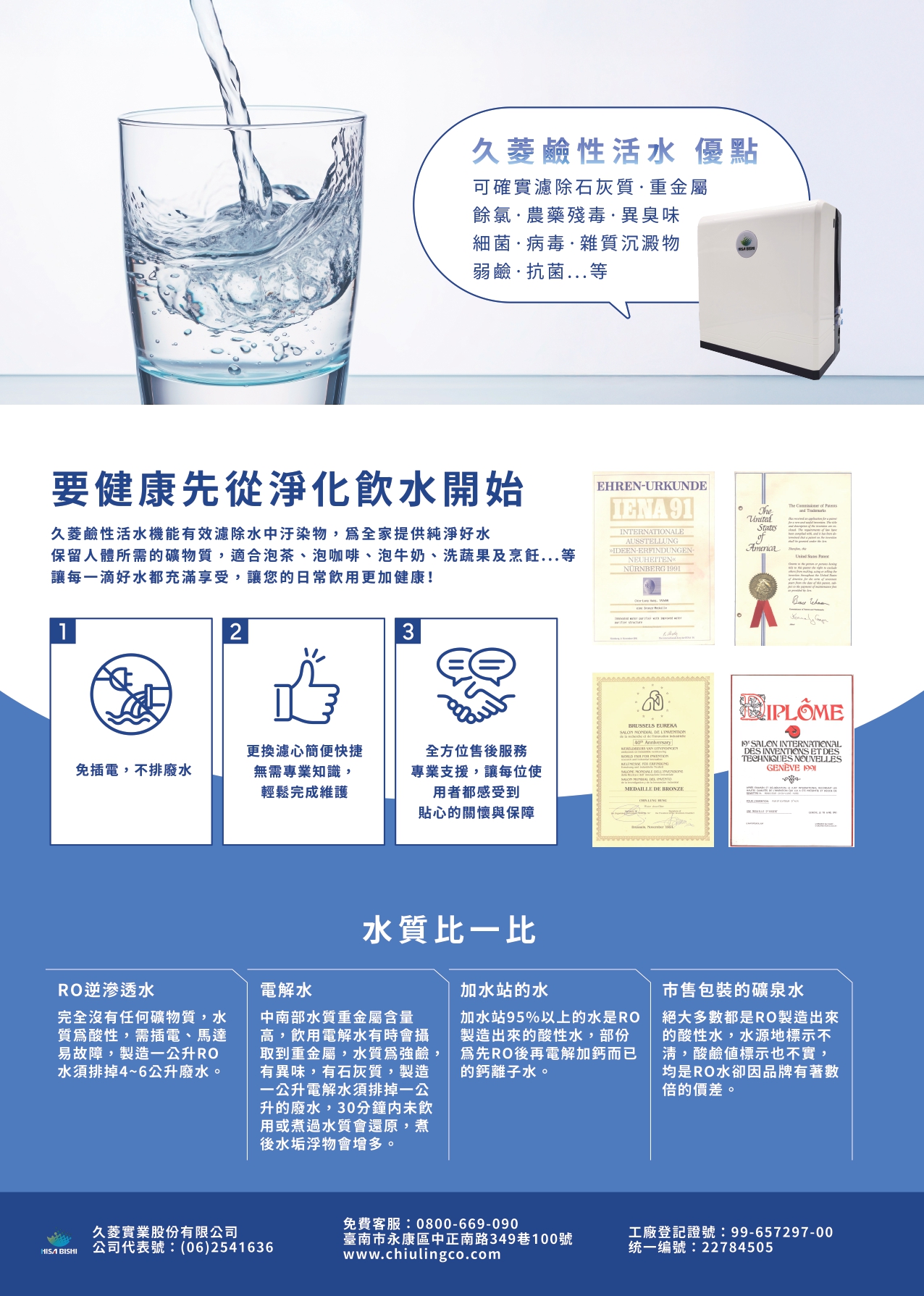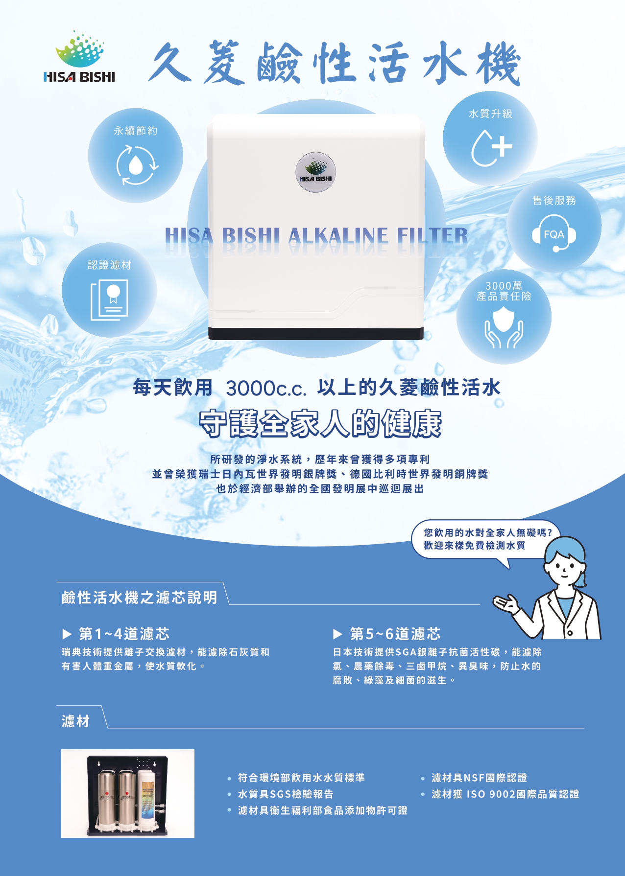 採用最新高科技精密水質處理系統,有效確實氯除各種水中污染物,淨化出清潔純淨,零污染,保有人體所需礦物質,真正能生飲弱鹼性健康活水!泡茶、泡牛奶、泡咖啡、洗蔬果、煮飯、煮湯...等口感更佳、更健康!產品規格
